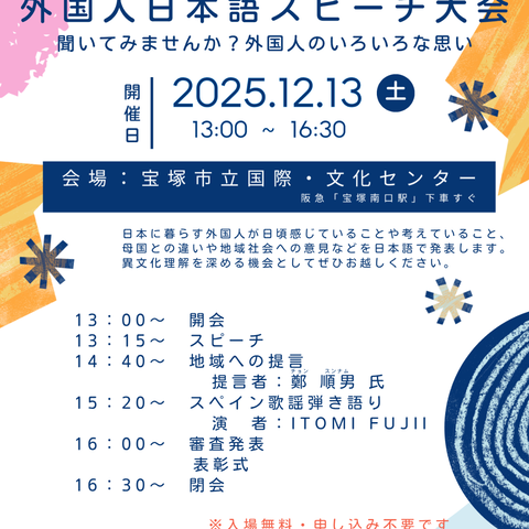 日本に暮らす外国人が日ごろ感じていることや考えていることを日本語で発表します。 地域への提言やスペ...