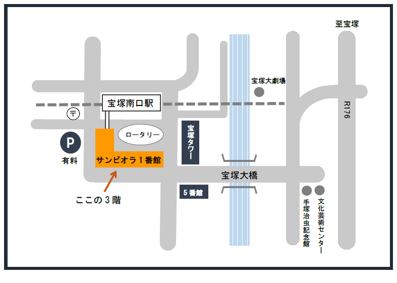 アクセス 住所&MAP 〒665-0011 宝塚市南口2丁目14番1号 サンビオラ1番館3階 宝塚市立国際・文化センター内 阪急電車今津線 『宝塚南口』駅 下車すぐ TEL 0797-76-5917 FAX 0797-76-5918 MAP