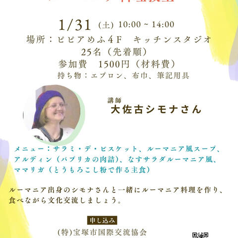 ルーマニア出身のシモナさんと一緒にルーマニア料理を作り、食べながら文化交流しましょう。 メニュー:...