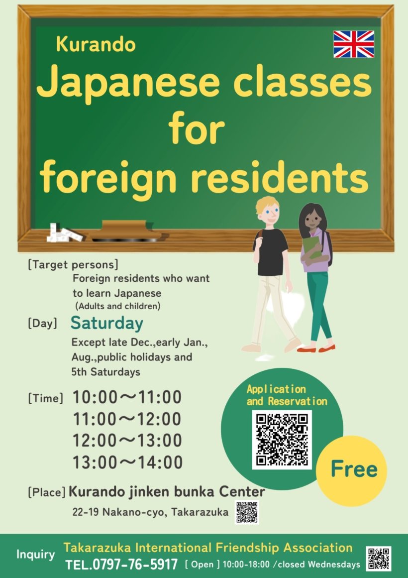 くらんど にほんご きょうしつ で にほんご を べんきょう しましょう。せんせい が 2人 まって います。 1かいめ は、よやくひょう の あいて いる じかん に きて ください。 あき の ない とき は、といあわせて ください。 2かいめ から は じぶん で よやくします。 4しゅうかんまえ から よやくできます。 ↓