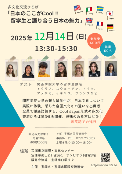 2025年11月15日(土) イベント情報 < イベント/お知らせ(ブログ) 多文化交流ひろば「日本のここがCool!! 留学生と語り合う日本の魅力」12月14日 開催日 12月14日(日) 時間 13:30~15:30 パネラー 関西学院大学の留学生 参加費 500円 定員 50名(先着順) 場所 国際・文化センター 要申込 0797-76-5917 関西学院大学の新入留学生が、日本文化について実際に体験し、感じた自国文化との違いを出席者全員で徹底討論する、Cool Japan形式の多文化交流ひろば第2弾。※英語での進行