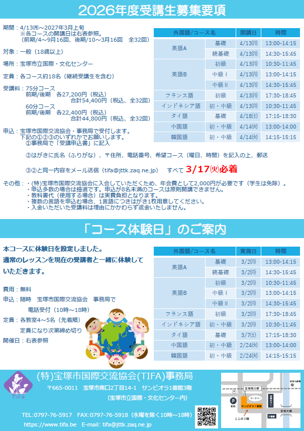 その他:・(特)宝塚市国際交流協会に入会していただくため、年会費として2,000円が必要です(学生免除)。