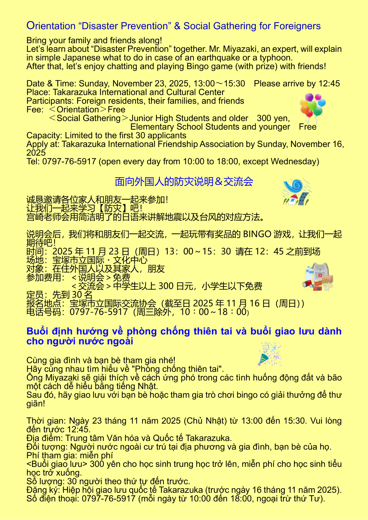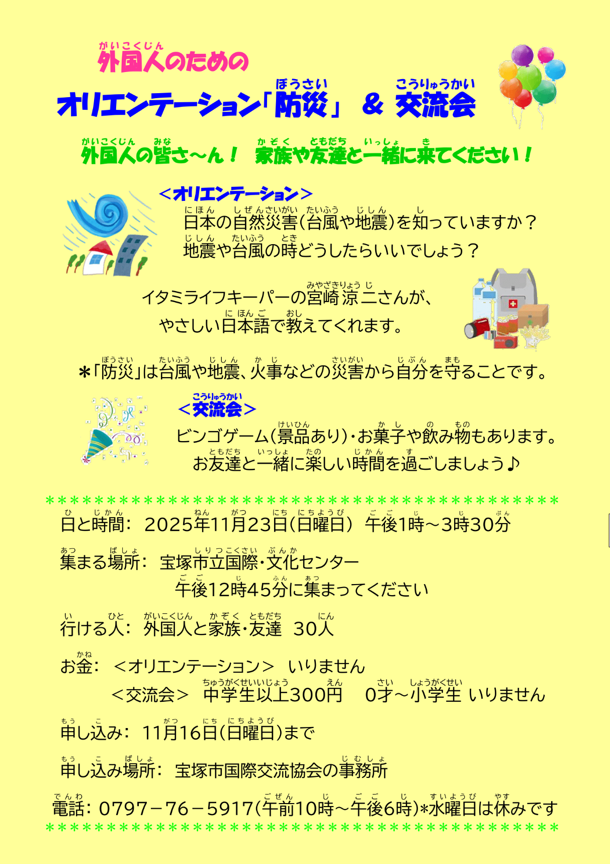 2025年10月10日(金) イベント情報 < イベント/お知らせ(ブログ) NEW 外国人のためオリエンテーション「防災」&交流会 いつ 11月23日(日) 時間 PM13:00~15:30(PM12:45までに来てください) 行ける人 外国人とその家族、友達 お金 <オリエンテーション>無料<交流会>中学生以上 300円、0才から小学生 無料 何人まで 30人 場所 宝塚市国際・文化センター 申し込み 0797-76-5917 (AM10:00~PM6:00 水曜は休み)