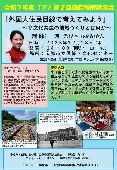 私たちのまちには、さまざまな国や文化の背景を持つ人々が暮らしています。 でも、彼らが日々どんなことを感じ、どんな思いで地域と関わっているか、知る機会は意外と少ないかもしれません。 今回の講演会では、多文化共生マネージャーの時光(とき ひかる)さんをお招きし、「日本で暮らすこと」「地域とのつながり」「文化の違いから見える気づき」など、実体験を通して語っていただきます。 外国人の目線から地域を見つめ直すことで、私たち自身の暮らしやまちのあり方についても、新たな発見があるかもしれません。 ぜひ一緒に「多文化共生」について考えてみませんか?