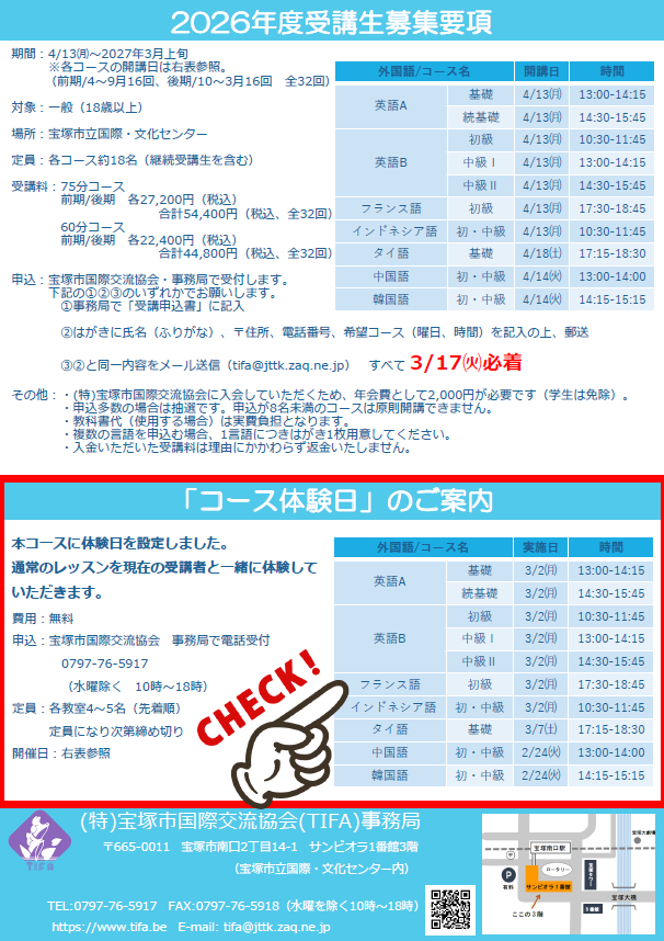 2026年02月02日(月) イベント情報 < イベント/お知らせ(ブログ) NEW 2026年度前期コース 体験会 2026年度前期外国語コミュニケーション教室の受講者を募集するにあたり、各コース体験会を実施します。 詳しいコース内容はこちら