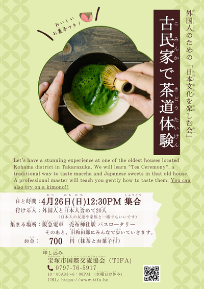 | 申込 | (特)宝塚市国際交流協会 0797-76-5917 10:00AM~6:00PM (水曜日は休み) |