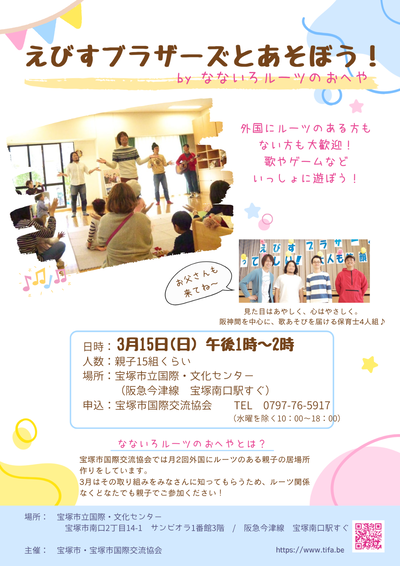 2026年03月15日(日) イベント情報 < イベント/お知らせ(ブログ) NEW えびすブラザーズとあそぼう! byなないろルーツのおへや 開催日 3月15日(日) 時間 PM1:00~PM2:00 人数 親子15組程度(先着順) 場所 宝塚市立国際・文化センター会議室1 要予約 0797-76-5917(特)宝塚市国際交流協会 外国ルーツのある人もない人も、えびすブラザーズと一緒に歌やゲームで遊びましょう♪ 宝塚国際協力フェスタ開催中。