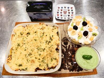 メニューはコッテージパイ、キューカンバスープ、トライフルです。