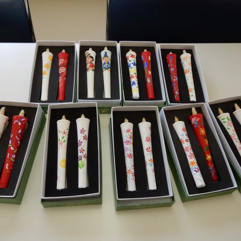 2月26日(土)和ろうそく絵付け体験教室で、約12センチの「和ろうそく」にアクリル絵の具で草花などの絵...