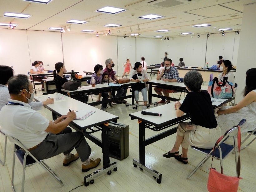 7月31日は5家族15人が集まりました。 (中国、アメリカ、オーストラリア、ドイツ) 子どもは大学生ボランティアと折り紙工作などをして楽しく過ごしました。大人は子育て支援ボランティアと一緒にどういう集まりにしたいかを話し合いました。