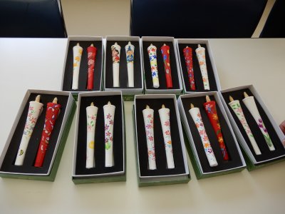 2022年02月28日(月) 活動報告(行事報告) < イベント/お知らせ(ブログ) 和ろうそく絵付け 体験教室 2月26日(土)和ろうそく絵付け体験教室で、約12センチの「和ろうそく」にアクリル絵の具で草花などの絵を描きました。講師から「和ろうそく」の素材は石油(パラフィン)から作られたろうそくではなく植物の「ハゼの木」から採取された天然由来の素材で色は基本的に朱色、白色の2種類からなり、点火すると普通のろうそくに比べて明るいことなど説明をうけました。殆どの方が初めての経験ということでしたが出来上がった作品は何れも素敵なのもに仕上がり大変喜ばれた企画となりました。