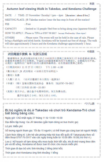 日本文化を楽しむ会「武田尾紅葉ウォーキングとけん玉遊び」 11月27日