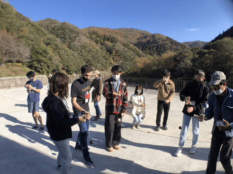 当日はJR武田尾駅に集合後、川沿いの廃線敷を歩いて親水広場へ。途中のトンネル内は暗いので、懐中電灯で照らしながら歩きました。親水広場では日本けん玉協会の先生方にご協力を頂き参加者がけん玉を教わりました。ほとんどの参加者にとって初めてのけん玉は難しいようでしたが、練習後にけん玉検定試験を受けて級の認定証を受け取った時は、皆さん嬉しそうでした。