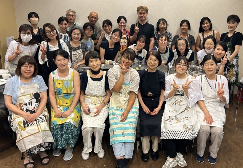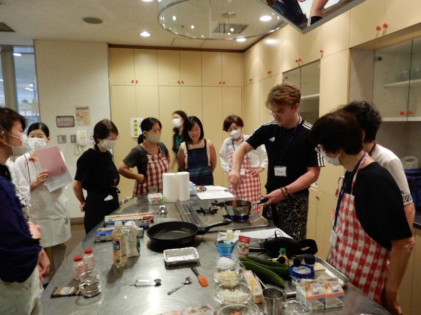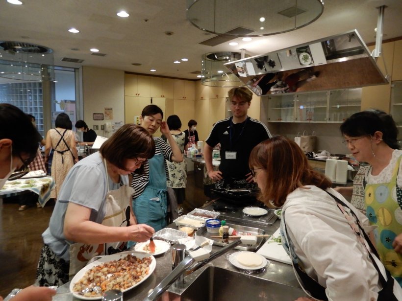 中学生からシニア世代までバライエティに富んだ参加者が、ケンブリッジ大学の学生Oliver Breedon氏を中心にパスティ、ファッジ、キューカンバーサンドウィッチの3品作りを楽しんだ。パスティとコーニッシュパイの違い、コーニッシュパイの由来などのお話をお聞きした後、野菜や肉を炒めてパイシートで包んだり、バターやチョコレートなどを溶かして混ぜて固めたり、キュウリを薄く切ってパンにはさんだりのデモンストレーションが行われた。試食後はOliver氏に質問するコーナーが設けられ、輪になって皆さんが思い思いの質問をし、異文化を知るとても良い機会になった。