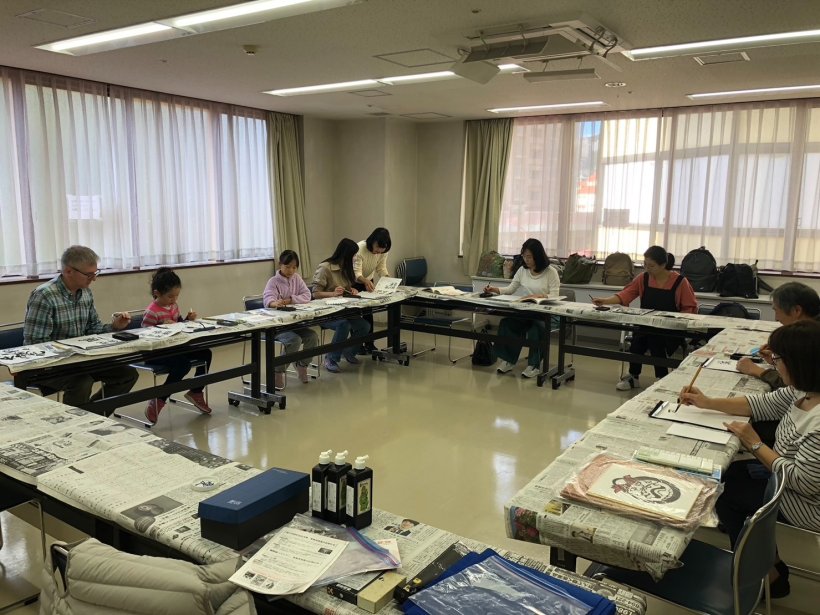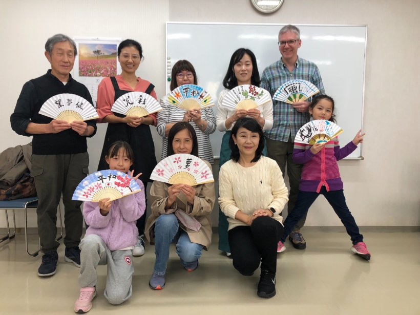 まずは、好きな「字」と「絵」を選んでもらい、先生が用意した筆で半紙に納得するまで練習してもらった。その後、用意された真っ白な扇子に文字を書き、希望する人は絵具で色付けや絵を書き足した。出来上がりはそれぞれ個性的ですばらしく、みなさん本当に満足そうでした。最後に各自作品を持ち、先生を囲んで写真を撮って解散となりました。