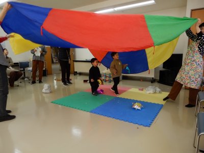 2024年02月03日(土) 活動報告(行事報告) < イベント/お知らせ(ブログ) 「なないろルーツ」1月27日 「おやこえいごえほん」のくりまさよしえさん来て頂きました。 英語絵本の読み聞かせと、新聞紙でスノーボールを作り、パラバールーンで遊んで楽しみました。