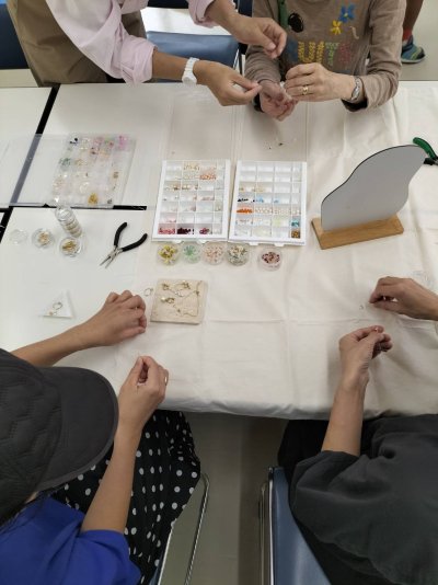 2024年11月05日(火) 活動報告(行事報告) < イベント/お知らせ(ブログ) 「なないろルーツ」10月26日 アクセサリー作家のyushicaさんを招いて、アクセサリー作りをしました。好きなパーツを選んで素敵なものができあがり、ひと時の癒しの時間が持てました。