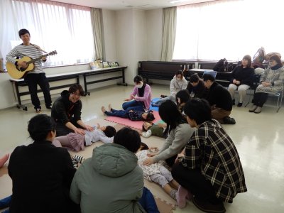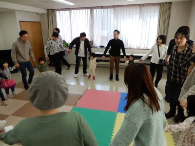 大きく体を動かしながらの歌あそび、パパママの膝の上での遊び、絵本の読み聞かせ、ホワイトボードシアターなど、ボリューム満点の1時間。最後は自分のパパママだけでなく他のパパママとも手をつなぎ、みんなで楽しめる時間だった。
